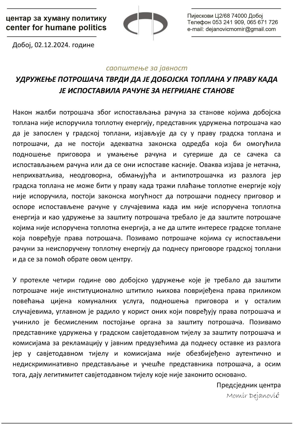 Ova izjava naišla je na oštre kritike iz Centra za humanu politiku. Predsjednik centra Momir Dejanović izjavio je da su tvrdnje predstavnika udruženja netačne, neprihvatljive i obmanjujuće. „Gradska toplana ne može biti u pravu kada traži plaćanje toplotne energije koju nije isporučila. Postoji zakonska osnova za podnošenje prigovora i osporavanje takvih računa, te bi udruženje za zaštitu potrošača trebalo da štiti njihova prava, a ne interese gradske toplane“, izjavio je Dejanović.