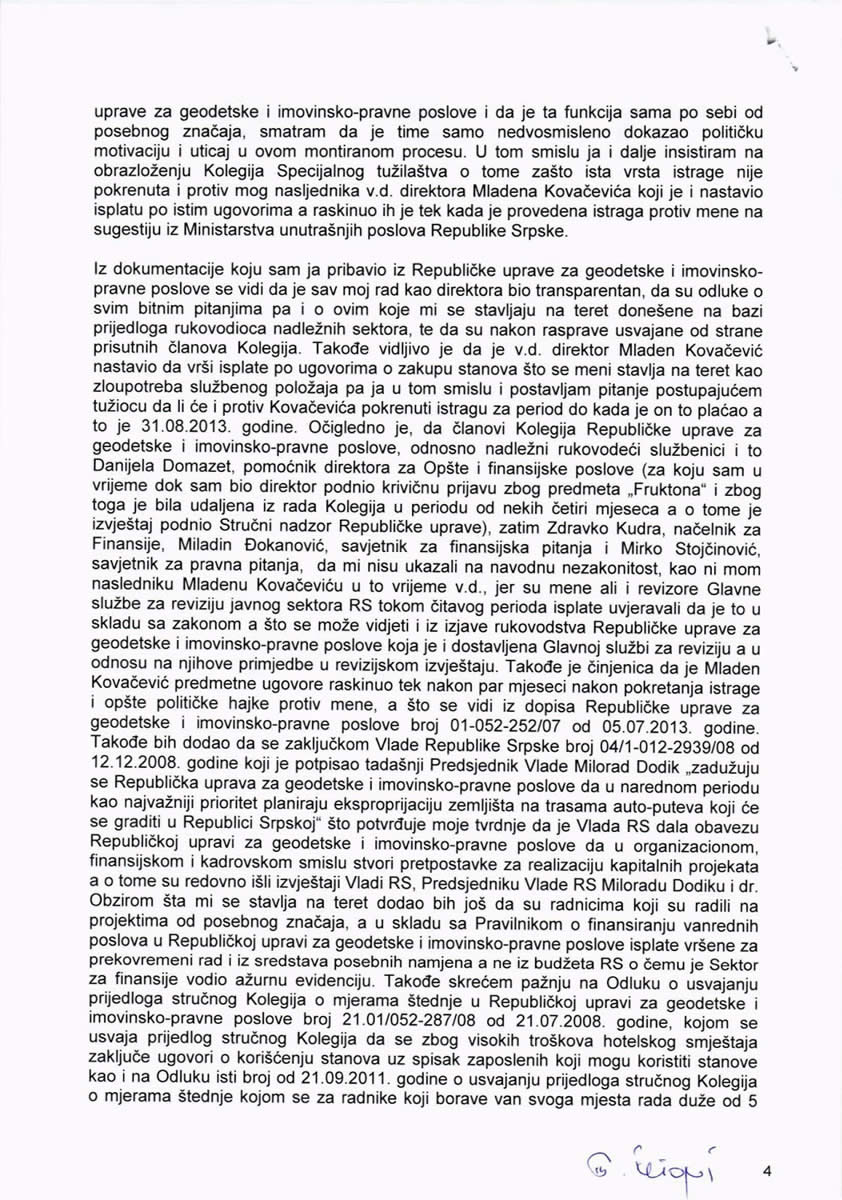 Budući da je Specijalno tužilaštvo nadležno za krivična djela organizovanog kriminala i zločinačkog udruživanja, te krivična djela protiv privrede i platnog prometa, i protiv službene dužnosti kada je zbog okolnosti izvršenja djela ili posljedica djela krivično gonjenje od posebnog značaja za Republiku Srpsku, zatražio sam od postupajućeg tužioca, Mladena Mitrovića, da mi pojasni kako je moguće da ono za šta me terete (a to je zakup 10 stanova za potrebe smještaja 51 radnika Uprave koji su radili na kapitalnim projektima –npr. autoput Banja Luka – Doboj, itd), bude u njihovoj nadležnosti.